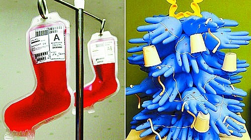 走进这家医院,不像以往闻到的都是刺鼻消毒水的味道:刚出生的宝宝,被圣诞袜包覆着;圣诞老人鞋形状的血袋,挂在支架上;令人恐惧的人体骨骼,都被戴上了头饰。甚至连手术手套,都被拿来做成小圣诞树,相当特别。