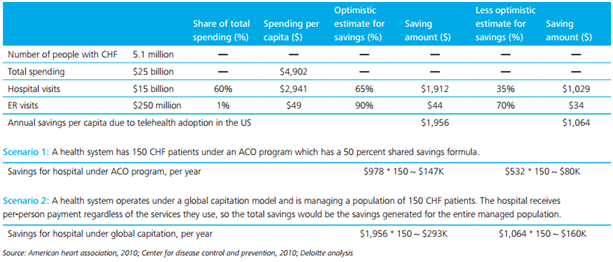 那么我们继续学习,德勤如何再次根据上文提到的CHF患者数据的进行分析(图4),结论是若成功进行远程医疗,一个包含150名CHF患者经ACO方案治疗的医疗系统每年可能节约80,000到147,000美元,假设储蓄率统一为50%且不考虑投资成本因素。医疗系统在全球按人计算模式下管理人口,对于这一特定人群采用基于远程医疗的互联医疗举措可能每年能够节省160,000到293,000美元。假设100%采用远程医疗,我们发现,每年可为美国CHF患者节省54.3-99.8亿美元。