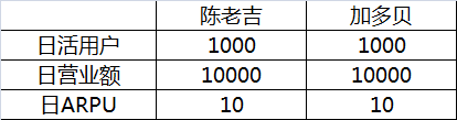 为什么我们将日ARPU拆分开来比较重要呢?举一个例子吧:比如说,有两个不同的移动App: 陈老吉和加多贝。他们都开通了App内增值服务收费功能,而且日ARPU值都是10元,表面上来看,陈老吉和加多贝的营业指标没什么两样: