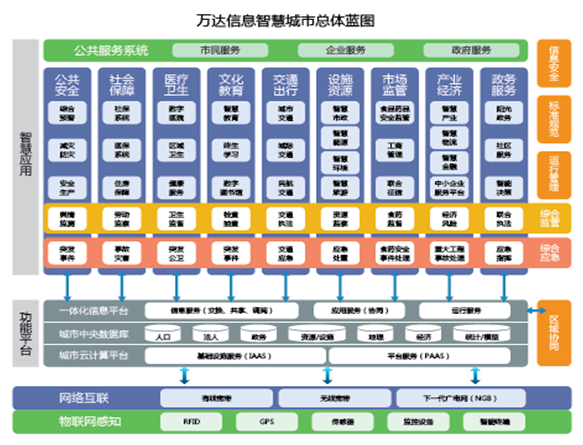 万达信息也将主要业务分成民生服务和智慧城市。所谓民生服务,我们认为主要是指万达信息在社会保障,医疗卫生,科技教育以及健康管理方面的传统服务。至于智慧城市,万达信息认为,城市信息化是智慧城市的必经之路,城市智慧化又是城市信息化的发展方向。万达信息智慧城市总体框架以物联网感知层和高速、泛在的网络互联层为基础,依托城市一体化功能平台,实现多个智慧应用的共享与协同,促进城市一体化的服务和管理。万达信息的理念就是,对一个地区多个方面的信息系统而言,IT基础设施可以共享,即政府统一搭建一套IT基础设施和城市数据中心,而不需要每个委办局重复建设,各委办局只需要根据业务要求选择相应的软件模块,就可以开展相关业务。当然,相关系统也可以实现数据和应用落地。通过城市信息化,将IT科技融入各行各业,让人们尽享更便利生活,并与环境和谐相处,从而构建智慧的城市。