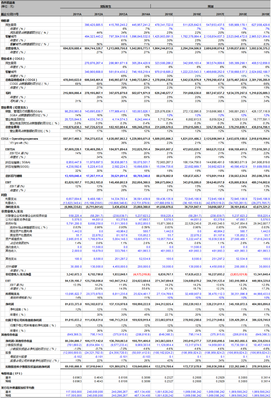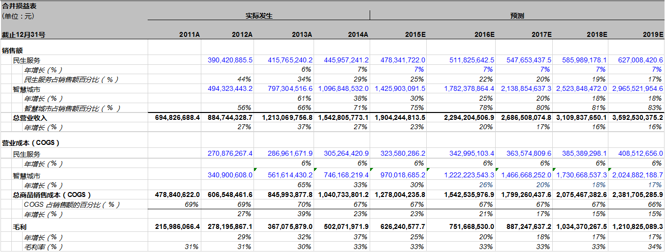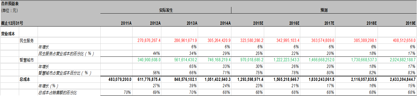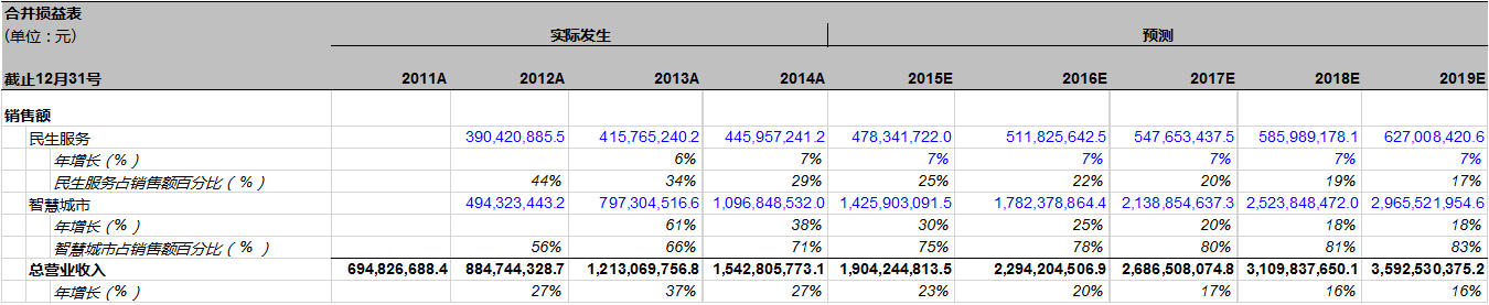 我们根据上述分析,大胆假设在未来5年,智慧城市收入≈75%的软件开发+85%的营运服务+85%的系统集成;由此可推测,民生服务收入≈25%软件开发+15%营运服务+15%的系统集成。