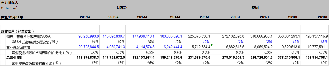 预测营业费用的步骤和预测营业成本是一致的。首先要做做研究,然后分析历史趋势, 然后看看哪些费用是固定费用,哪些是变动费用。在上面利润表分析里,