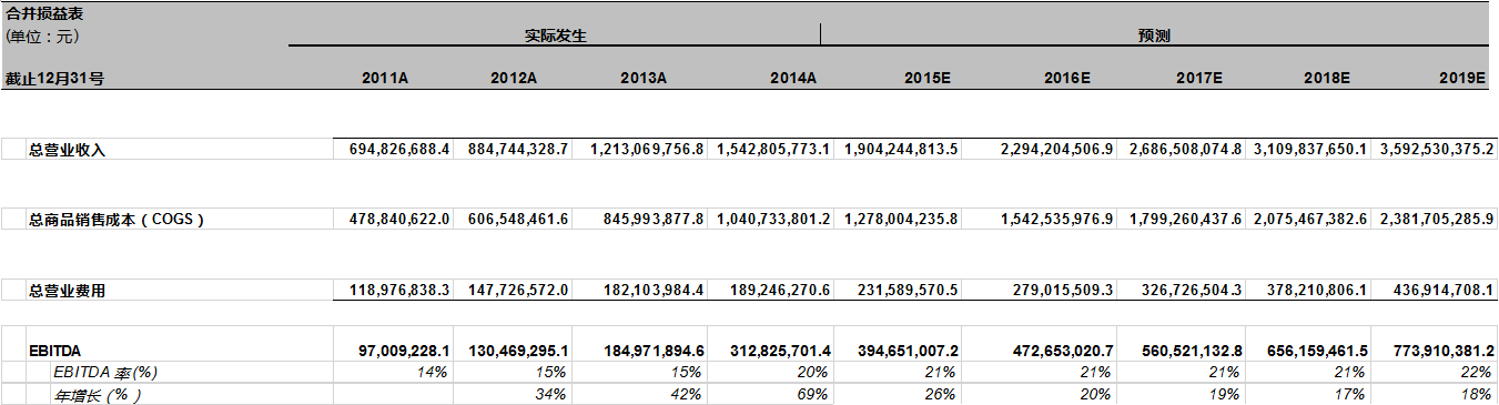 (2014)。这个比例还算非常的稳定和一致,这种稳定和一致告诉我们营业成本是典型的变动成本,他的增长率应该不出意外和营业收入的增长率类似。我们注意到2014年的营业成本同比增长百分比(24%)小于营业收入增长的百分比(27%),但是在2014年年报里并没有说明原因,