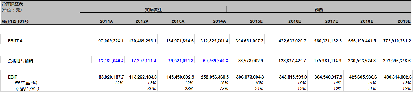 在调整后的利润模型里,折旧和摊销从管理费用和营业成本里分离出来,单独放在EBITDA的下面,折旧和摊销的预测是比较复杂的,我们有意将这个预测放在后面再做详细的解释。