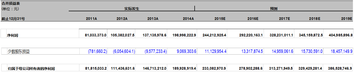 ,既然少数股东权益是一个基于所有权的支出,那我们用2014的比例来预测2015年是比较符合逻辑的,除非我们能证明所有权的比例发生了显著变化。那么我们还是用4.6%作为未来五年年少数股东损益占净利润的百分比,由此,我们预测未来五年少数股东损益=2014年少数股东占净利润的百分比*未来五年净利润。