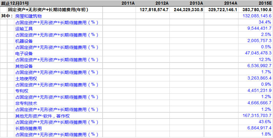 好了,让我们开始建一个折旧计划表。这时,我们就要做一个假设,假定2014年12月31号的固定资产,无形资产以及长期待摊费用净值就等于2015年1月1号的固定资产,无形资产以及长期待摊费用的净值。2014年度固定资产,无形资产以及长期待摊费用合并净值为383,780,190.6元,那么我们就认为这个数字就是2015年年初固定资产,无形资产以及长期待摊费用合并净值。有了这些,我们还不能开始计算折旧和摊销, 因为我们还必须给资产分类:根据万达信息的年报披露信息,万达信息的固定资产分为5大类,分别是:房屋及建筑物,运输设备,专用设备,通用设备以及其他设备;无形资产分为4大类,分别是:土地使用权,专利权,非专利技术,以及其他无形资产。万达信息在年报里没有解释什么是其他无形资产,但在无形资产使用寿命估计情况里描述了软件和著作权。 我们认为万达信息里的其他无形资产就是指软件和著作权。