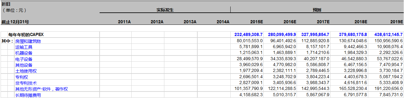 现在我们可以根据万达信息定义的折旧及摊销年限和残值率开始计算未来五年的折旧,摊销以及长期待摊费用了,如下图表所示: