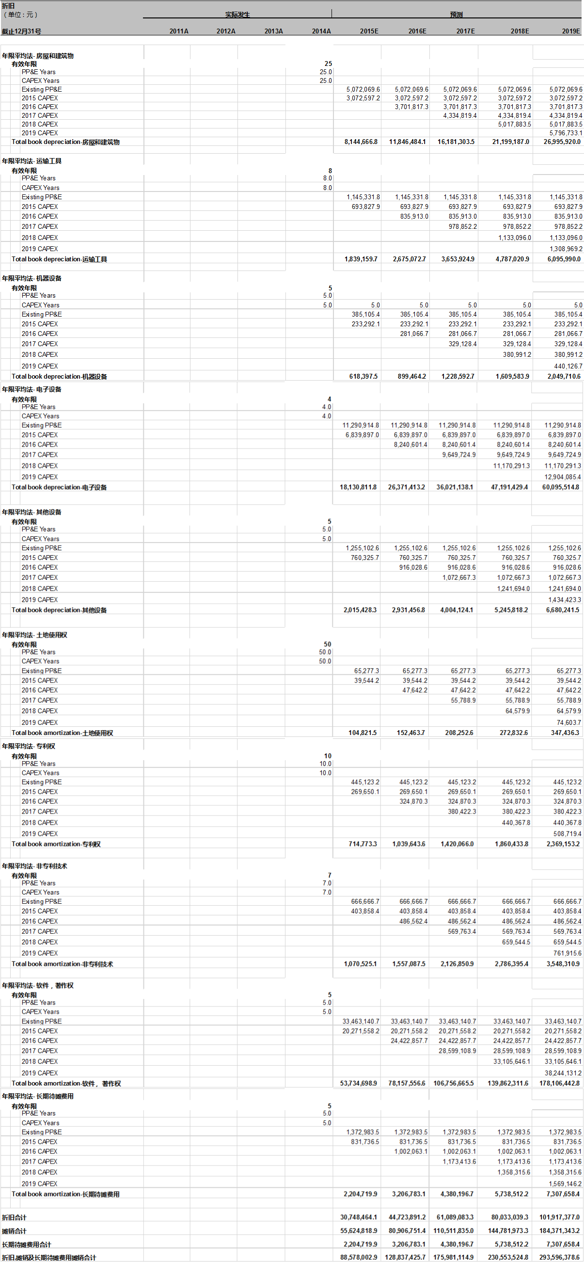 这样,我们就完成了未来五年折旧,摊销以及长期待摊费用的预测。在我们将这些数据链接到利润表之前,我们还需要看看这些数据是否合理。从过去四年折旧及摊销合计的增长率来看,他们是快速增长的,2014年比2013年同比增长55%。 未来几年的增长率也分别为:45.7%(2015),45.4%(2016),36.5%(2017),31%(2018)以及27.3% (2019) 。似乎都在合理的范围之内。如果我们发现增长太慢或过快,我们可以通过调整折旧及摊销有限年限来解决。我们无法算出最正确的答案。算出最正确的答案的基础是我们要有资产详细的信息:成本,购买日期,每个资产的有效年限等等。我们知道,我们不可能拿到这些详细的信息,那么,我们所需要做的就是找到规律,跟随大趋势。