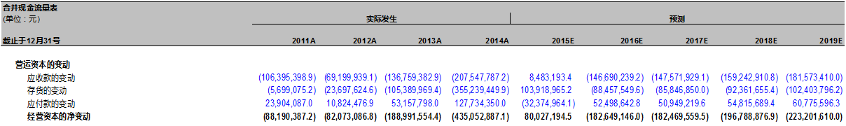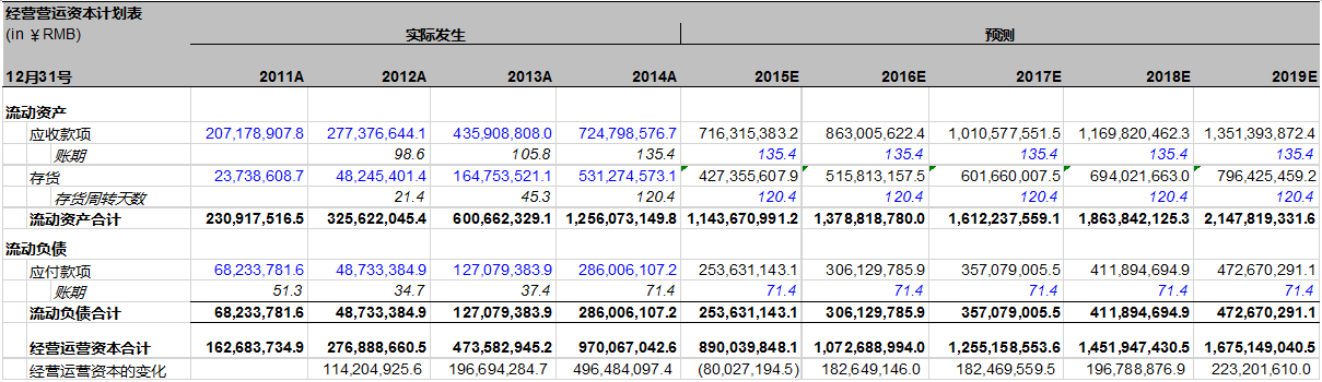 为了预测经营营运资本,我们将用2014年的账期作为预测未来的营运资本的指标。