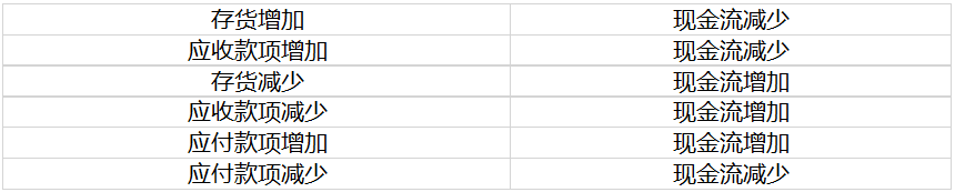 反过来看,如果2014年的存货比2013年减少了,我们可以认为我们已经将减少的部分卖掉了,这样就导致了现金的增加。同样,如果应收款项减少的话,我们就可以认为,这笔钱公司已经回笼。所以应收款项减少,现金就会增加。