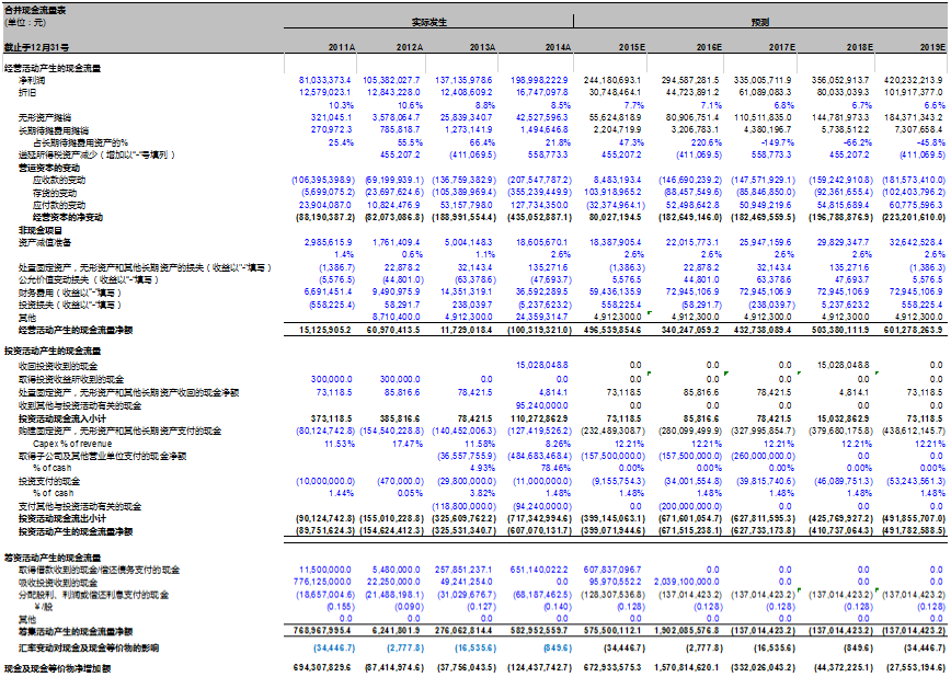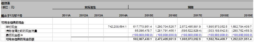 到这个时候,我们就要来算算现金了, 2015年的年初现金=2014年的年末现金。债务偿清之前的现金流量是指万达信息在本年度产生的所有现金减去所有支付的现金,但是,由于借贷产生和支付的现金除外。 这点很重要, 因为我们要知道万达信息到底有多少现金能用来偿还债务。 我们在回到前面的现金流量表, 我们要从现金流量表里将除了债务之外的现金都加起来。也就是说, 我们要把短期借款/偿还以及长期借款/偿还都排除在外。