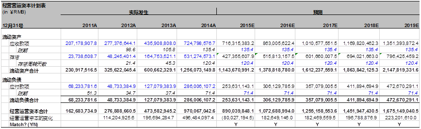 在做这个计划表的第一步,我们必须从万达信息资产负债表里找到上一年的现金和债务余额。 这一步很容易, 因为我们已经在上一个章节完成了资产负债表。 那么2014年资产负债表中的货币现金余额就等于借贷计划表中的2014年年末现金额。