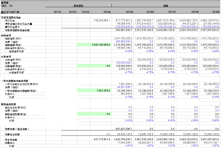 借贷计划表可以跟踪万达信息每笔主要债务以及和债务相关的利息和偿还计划。这个计划表也可以跟踪现金的供应量,是否这些现金的供应足够用来偿还债务。我们也可以推算这些现金能产生多少利息收入。当这个借贷计划表完成以后,我们的模型就会出来一个“循环引用”。这个循环引用和模型的其他表格链接起来。不要小看这个循环引用,它能告诉我们一个公司最多能借多少钱。而且要保证公司还有余钱来支付利息等等。
