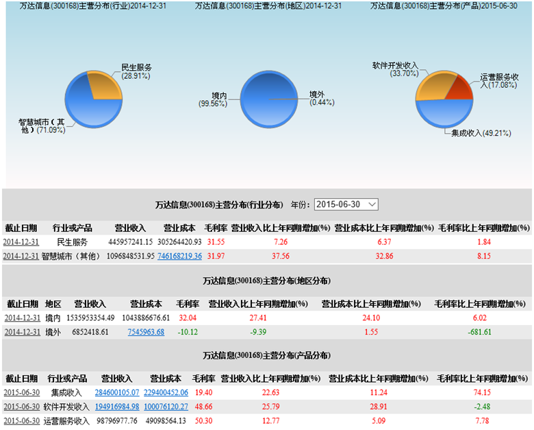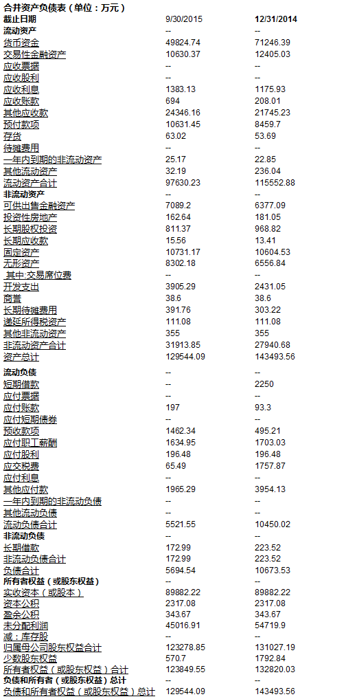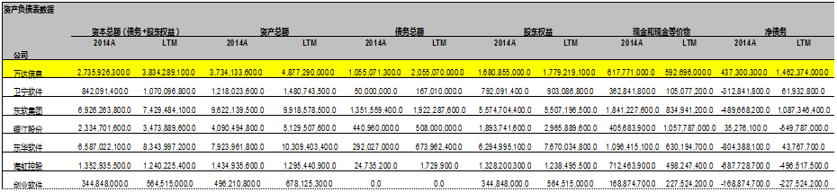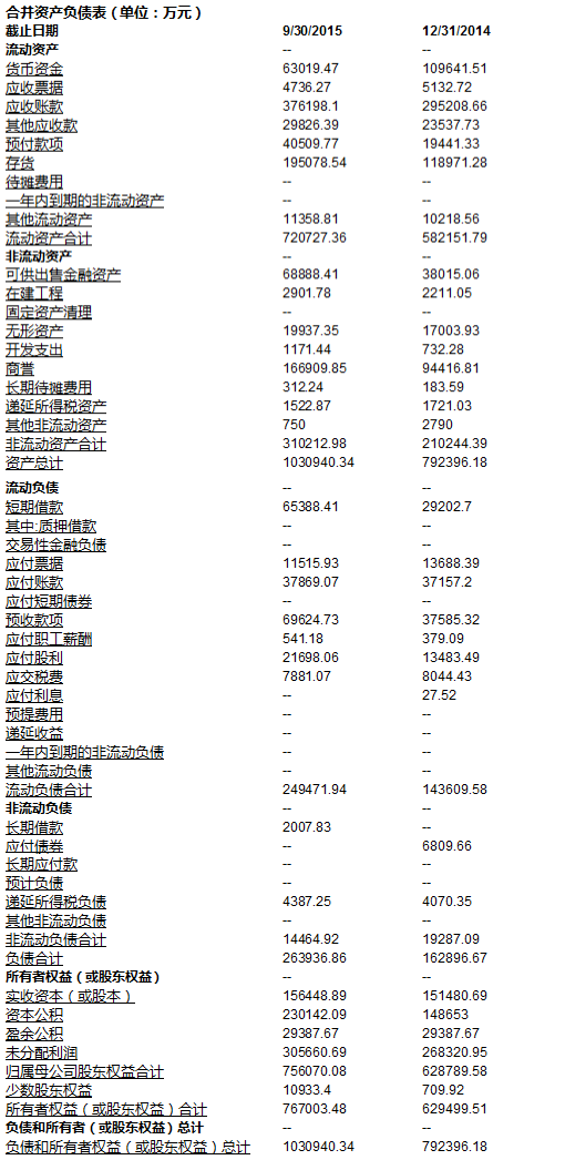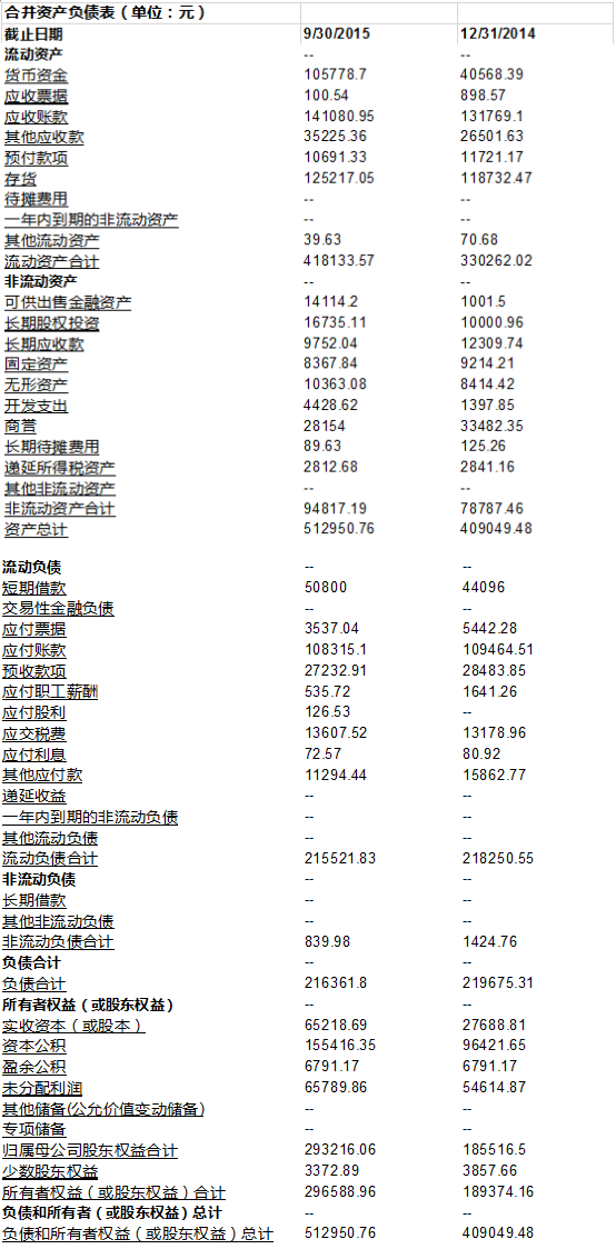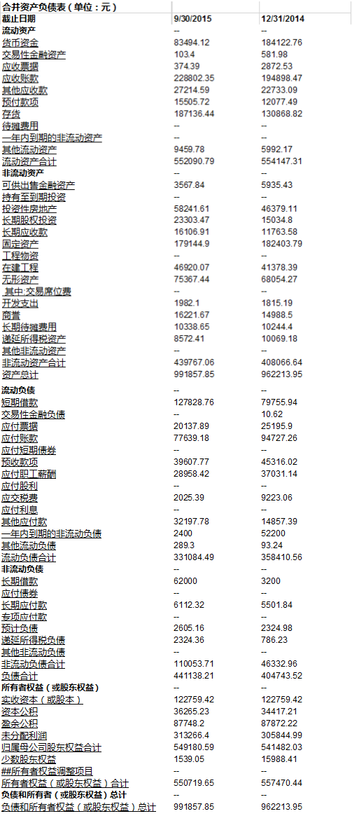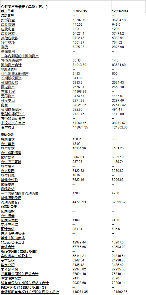 关于资产负债表的数据, 我们就直接从万达信息年报(截止2014年12月31日)和季报(截止2015年9月30日)里摘取: