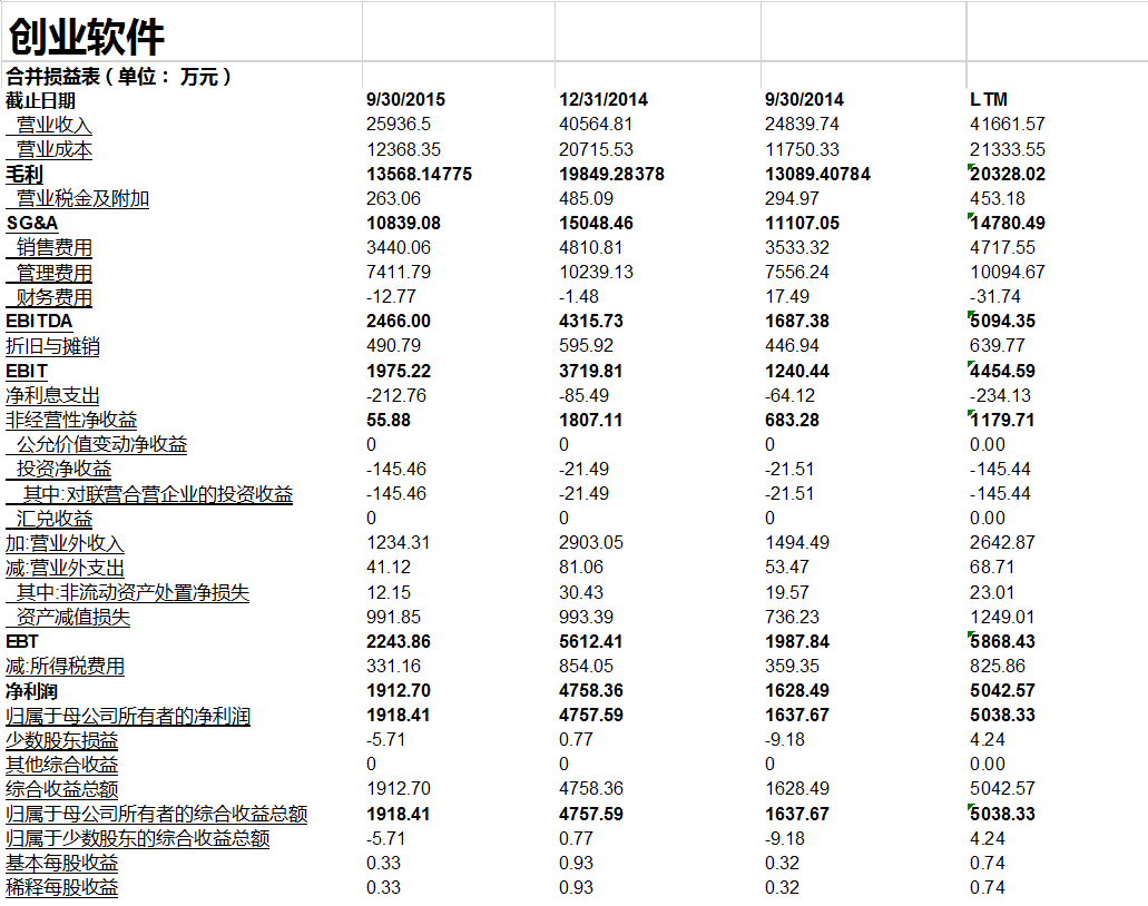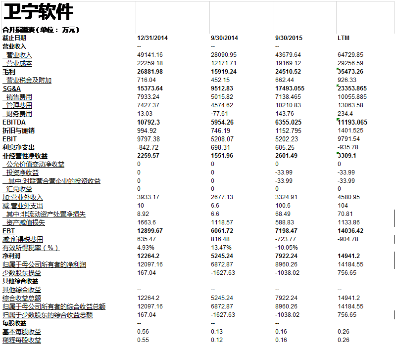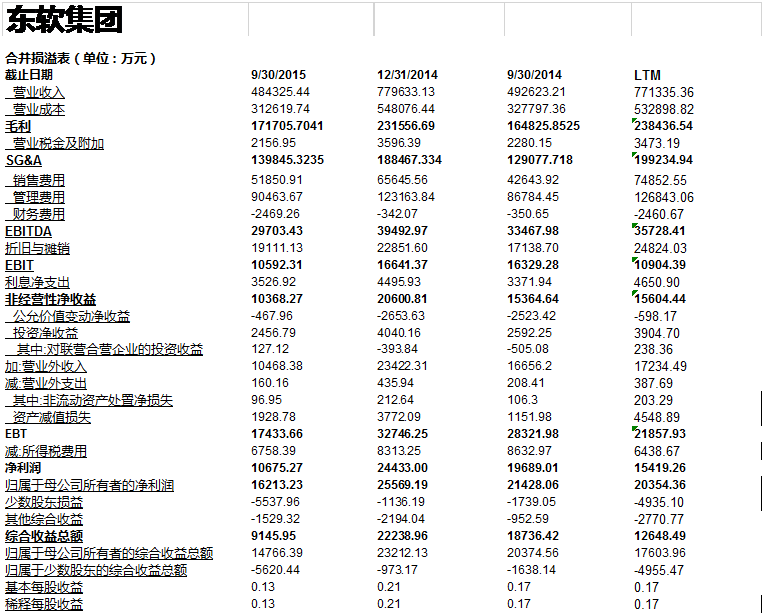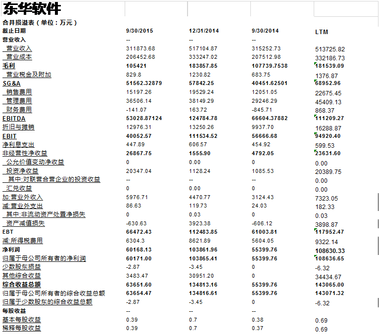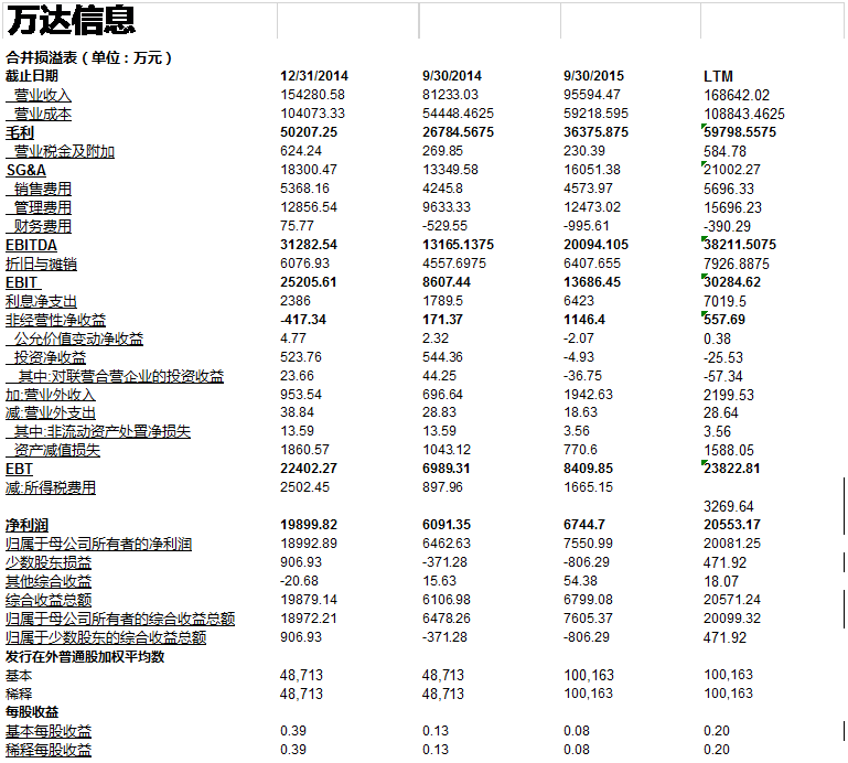 在我们计算关键财务数据,比率以及交易倍数之前, 我们需要讲一讲LTM的计算。 为了计算最近期的财务数据, 我们需要将年度财务报表和季度财务报表合在一起来考量。尽管我们已经有了万达信息基于年度报告创建的模型, 但是为了和可比公司进行比较, 我们还需要看看万达信息和可比公司最后12个月的财务指标。这是因为可比公司分析要求比较最近期的财务指标。 我们很容易在巨潮咨询网里找到万达信息和可比公司的季度报告(最近期的季报是2015年第三季度报告)。