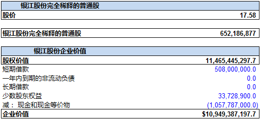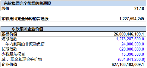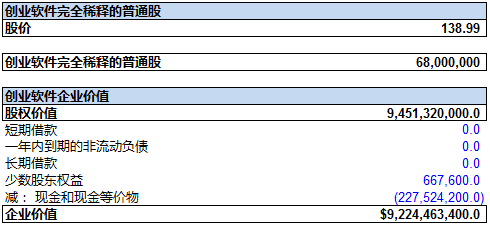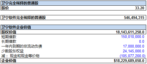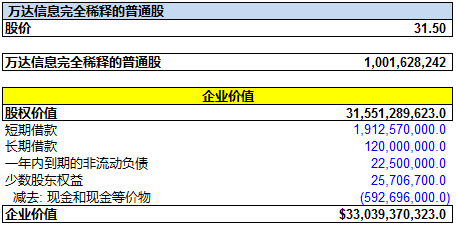 我们再用资产负债表的数据,特别是债务总额和现金总额数据, 加上之前计算的股权价值, 来确定万达信息的企业价值。 截止2015年9月30日, 万达信息的借债总额(未偿)为: 20.55亿元(短期借款, 长期借款以及一年内到期的非流动负债之和), 再加上少数股东权益为2570万元, 减去货币现金及现金等价物5.93亿元。再加上股权价值316亿元, 我们得出万达信息的企业价值约为:330亿元。 如下图所示: