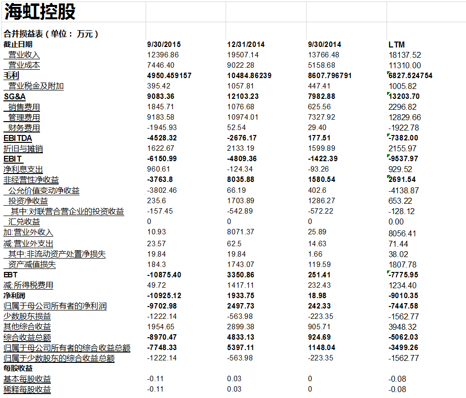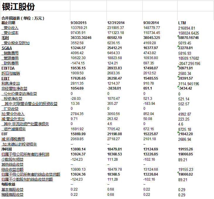 为了与可比公司进行比较,我们必须致力于找出所需要的财务信息以便找出每一家可比公司的关键财务数据。 我们用可比公司2014年年度(截至日期2014年12月31日),以及2015年第三季度(截止日期2015年9月30日)报表作为历史财务信息的主要来源。 这些报表为我们提供了计算LTM(最后12个月)数据所需要的所有财务数据。