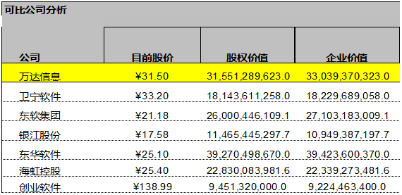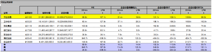 我们用两种方法来计算终值的考量是希望这两种方法可以相互验证。但得出的结论却大相径庭,使得我们伤透了脑筋,又一次陷入两难的境地。这是因为基于EBITDA倍数法计算的终值的现值(约409亿)要大大超过基于永续增长法所计算的终值的现值(约33亿)。 用两种方法推算出来的估值范围也严重脱节,这是为什么呢? 一般来说, 如果用倍数法计算出的终值远远大于用永续增长法计算的终值的话,这说明, 市场有极大可能被高估了。 还有一种可能就是对永续增长率设定过低,但是, 这种过低永续增长率的担心的可能性基本可以排除。凭良心说,我们已经将永续增长率设定在一个较高的比率。 这样的话, 我们几乎可以肯定, 万达信息的市场价值被过高的估计了。 如果我们对关键性假设(永续增长率, WACC)没有问题, 这也说明万达信息的自由现金流并不能承托市场赋予它这么高的价值。 这还是一个可以值得投资的股票吗? 先别急,我们下面要看看市场上的类比企业的情况。这就是我们今天要讲的用可比分析法来给万达信息估值。
