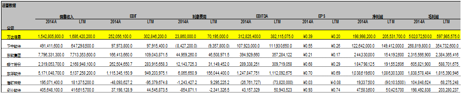 可比公司分析可以提供一个市场基准,这样,我们就可以依照这个基准来分析万达信息在某个时间点的价值。 我们所说的基准就是和万达信息类似的公司, 这个类似公司能为万达信息提供一个相关性很强的参考。 但是这个类似公司需要和万达信息具有相同的核心业务和财务特征或风险。可比公司分析最困难也是最核心的部分在于寻找类似公司/可比公司。 和上面的用贴现现金流分析的估值方法不同, 可比公司是要根据市场形势以及投资人的心态来反映当前估值,所以, 在大多数情况下,用可比公司分析要比贴现现金流分析所产生的“内生性价值”更接近于市场,也就是说和市场的相关性更强。 但是, 市场不见得是理性的,其波动性可能受到投资者心态和情绪的影响,这很有可能导致估值过高或者过低。 我们之前在确定贴现现金流分析的终值时,使用和市场相关性很强的EBITDA倍数法和使用和自由现金流相关的永续增长法,所产生的估值结果就大相径庭。 可比公司分析还有一个问题就是,我们不可能找到完全一样的公司,所以根据类似公司交易价值来确定的估值可能与公司的真实价值不符。