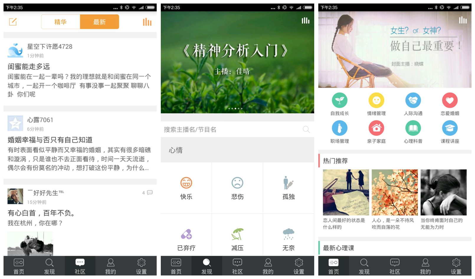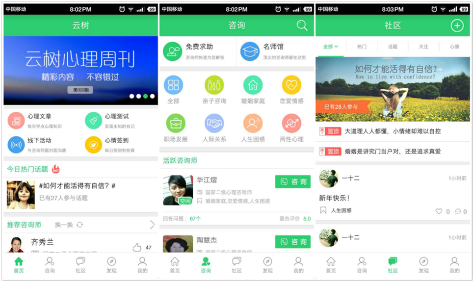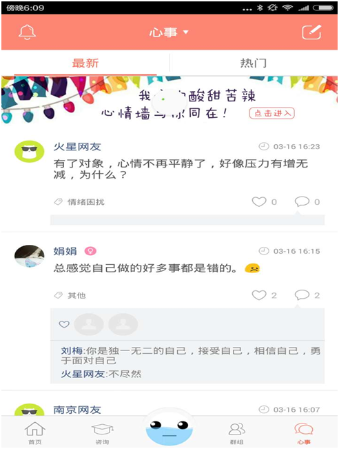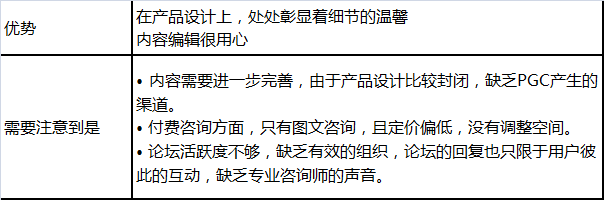 社区:用户会将自己的心情和经历拿出来分享,其他热心的用户也七嘴八舌的出主意。这类的自发的社区讨论,由于没有专业的引导,大多只是情感宣泄的窗口,没有达到治疗和咨询的效果。不过,社区是很好产生热点话题的地方。