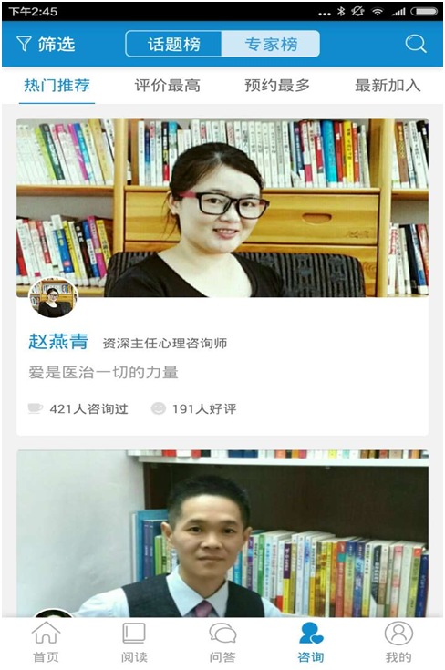 咨询分页按照话题和专家两种方式进行预约检索。