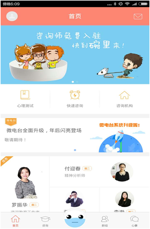 首页包括心理测试、快速咨询、咨询机构等分栏,还有微电台和热门百科的。