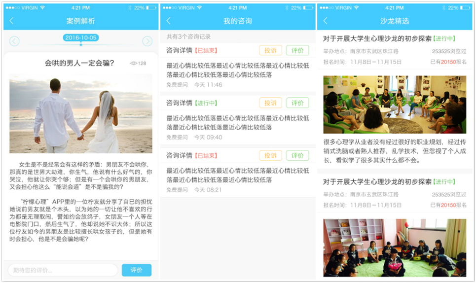 咨询:云树的运作模式很简单,用户可以选择自己中意的咨询师进行预约,也可以就自己存在的问题进行描述,然后由咨询师“抢单”,通过电话沟通或者当面交流的方式来解决用户存在的心理问题。据了解,目前通过认证的心理咨询师有两百多名。在进行电话交流时,为了确保双方的个人隐私,由平台来连接双方的电话。而在线下交流时,平台要求见面地点必须是咨询师自己的办公场所。