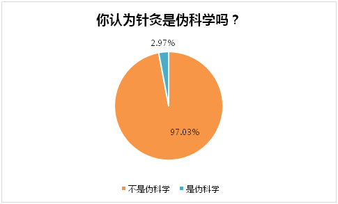 在这次调查中我们可以发现,对于你认为针灸是伪科学吗?这个话题,有97.03%的医务工作者认为针灸不是伪科学,只有2.97%的医务工作者认为是。由此可见,基本上所有的医务工作者都反对“针灸是伪科学”这一说法。