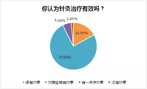 对于针灸治疗是否有效这一问题,大多数的医务工作者都认为针灸对于某些病有效果,16.99%的医务工作者认为针灸很有效果,5.94%的医务工作者认为有一点点效果,1.49%的认为没有效果。