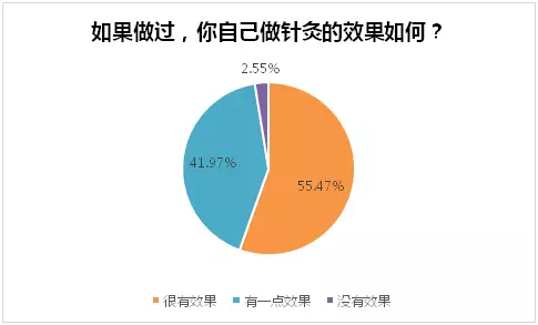 在做过的人群中,超过半数的人都认为做过之后很有效果,41.97%的人认为有点效果。剩下的,2.55%的少部分人认为对于他们来说没有效果。由此结果表明,针灸治疗对于绝大多数参与调研的医务工作者都或多或少起到了一定疗效。