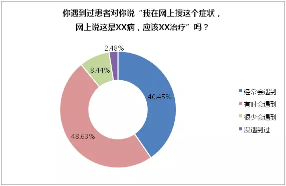 在这次调查中我们可以发现,对于你见过靠“网络搜索”看病的患者吗?这个话题,有40.45%的医务工作者经常会遇到类似的患者,48.63%的医务工作者有时会遇到,8.44%的医务工作者很少会遇到,只有2.48%的医务工作者从来没遇到过。由此可见,大多数患者去医院看病之前都会通过网络搜索相关疾病。