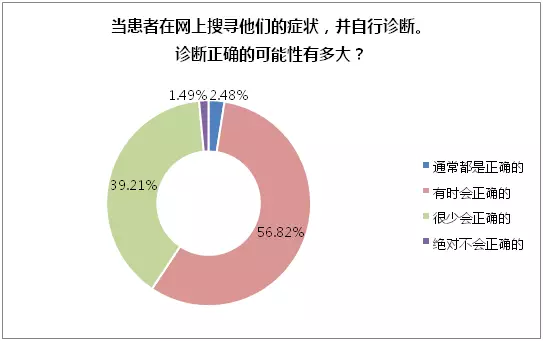 当患者在网上搜寻他们的症状,并自行诊断时。2.48%的医务工作者认为他们的诊断通常是正确的,超五成的医务工作者认为有时是正确的,接近四成的医务工作者认为很少会正确。而1.49%的医务工作者认为如此诊断绝对不会正确。不管怎样,看病还是去医院比较可靠!