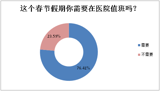在这次调查中我们可以发现,对于这个春节,你值班吗?这个话题,有76.41%的医务工作者需要在医院值班,23.59%的医务工作者则不需要值班。由此可见,大多数的医务工作者在春节假期期间仍然坚守在工作岗位。