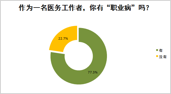 从本次调研数据来看,绝大多数的医务工作者这都有“职业病”,大概二成多的医生没有“职业病”,可以看出在平时高强度的工作压力下,医务工作者患“职业病”的几率很高,临床工作非常辛苦。