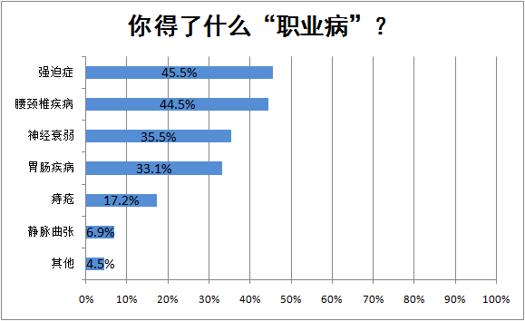 医务工作者患强迫症和腰颈椎疾病的较多,还有一部分的人容易神经衰弱,患胃肠疾病,有过痔疮和静脉曲张的医务工作者也不在少数。