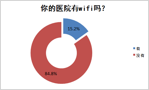 从本次调研数据来看,绝大多数的医务工作者所在医院是没有wifi的,仅有15.2%的医务工作者的医院有wifi 提供。