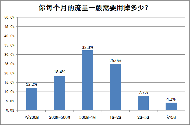 平时医务工作者使用流量最多的大致在500M-1G之间,其次每月需要1G-2G流量的人也不在少数,有18.4% 的每月的流量在200M-500M区间,少部分人一个月需要5G以上的流量。