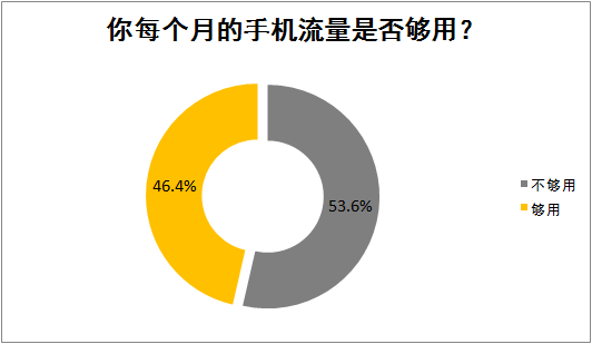 关于流量是否够用,大家的回答各占一半左右,53.6%的医务工作者表示自己的手机流量不够用,46.4%的人每月的手机流量是够用的。
