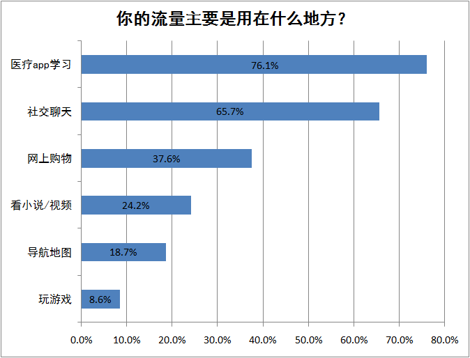 医务工作者平时流量使用最多的地方是医疗APP学习和社交聊天工具,还有一些人需要网上购物、看小说/视频和导航地图上,会花去一些流量,8.6%的医务工作者需要手机流量来玩游戏。