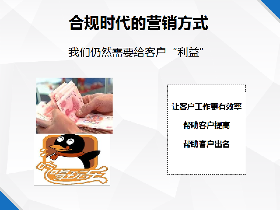 合规时代营销方式,我们仍然需要给医生“利益”,那就是帮助他们提高工作效率,提升其水平和知名度。因此新常态下,医药代表的职能发生转变,需要升级的是,大量使用移动互联手段,进行数字营销,进行客情服务。需要去除的是销售贿赂、代金销售和学术补贴。