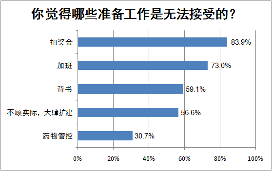 对于各类准备工作,医务工作者最无法接受的是扣奖金,其次是加班,而背书和不顾实际大肆扩建也有很大一部分人表示无法接受,接受不了药物管控的人相对较少一些。