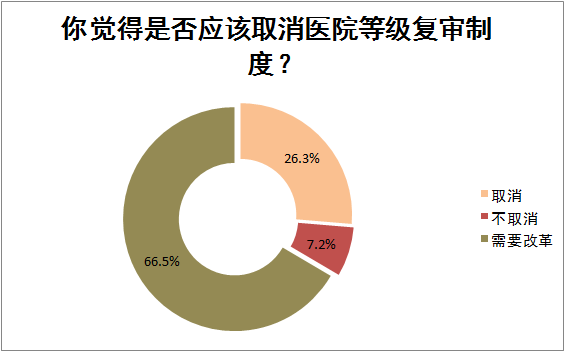 关于是否取消医院等级复审制度这个问题,66.5%的医务工作者认为需要进行改革,近三成的人认为应该取消,而有7.2%的医务工作者表示不需要取消。