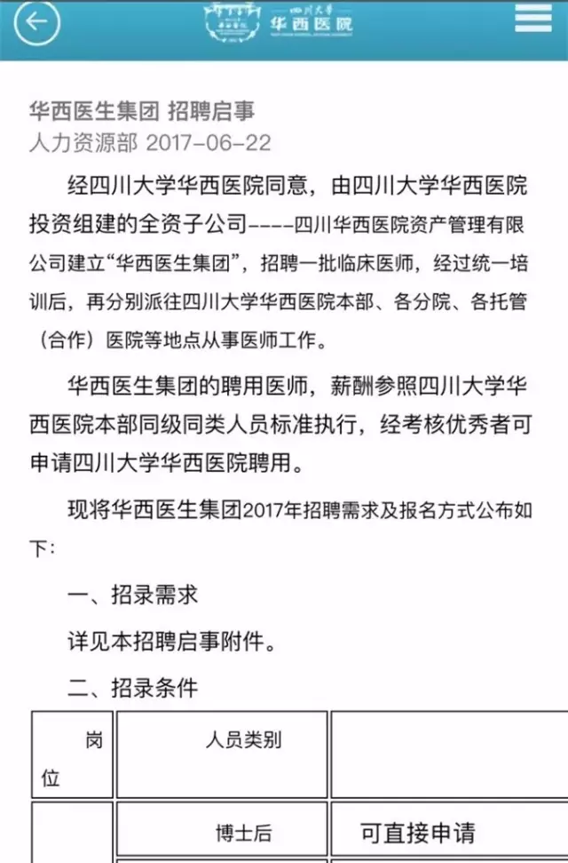 我们可以看到,华西这次招聘的是初级职称及以下的人才,这些人在临床都是干活的主力。同时没有编制,是隶属于华西下面一个公司的合同雇佣工,经培训后在华西的各个附属机构内执业,所以这个跟我们在部队医院或地方医院招聘的合同工还不一样,属于劳务派遣,随时可以不要。