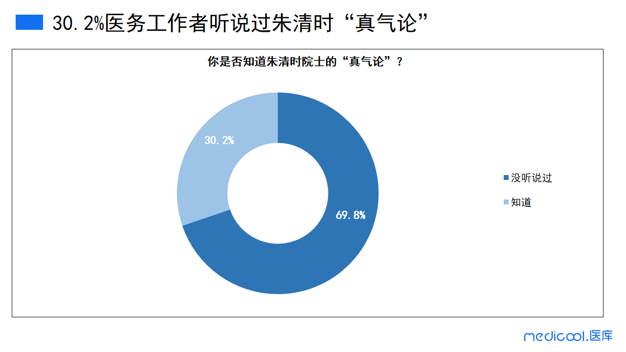 从这次的调研数据我们可以发现近七成的医务工作者并未听说过朱清时关于“真气论”的言论,有30.2%的医务工作者表示听说过朱清时“真气论”。