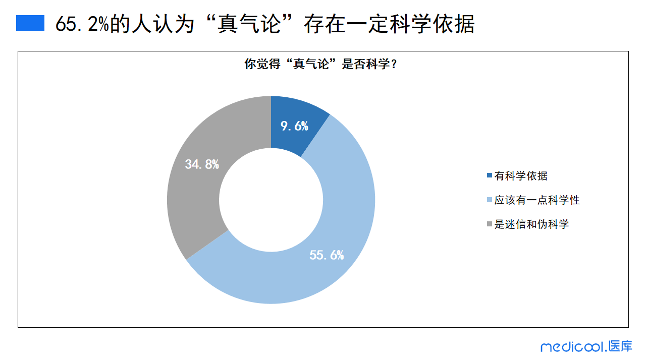 调查结果告诉我们,很大一部分人认为“真气论”是存在一定的科学依据,其中9.6%的表示有科学依据,55.6%的人认为应该有一定的科学性,只有34.8%的医务工作者觉得这是迷信和伪科学。