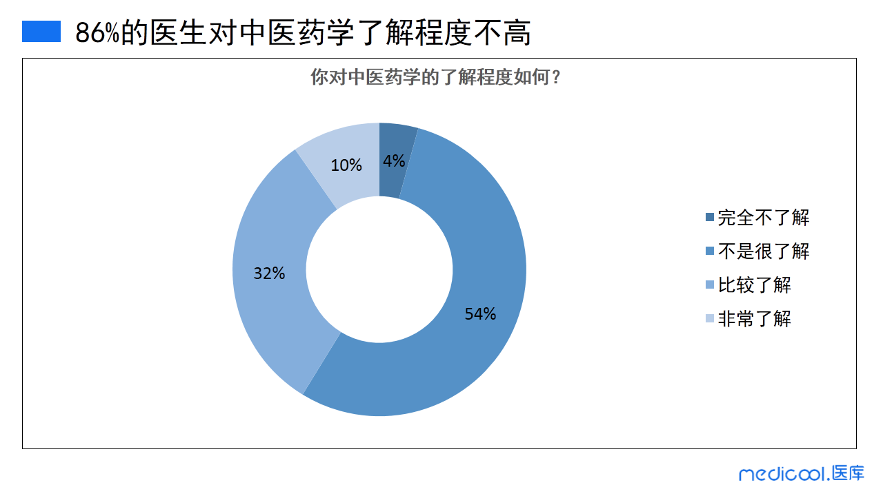 我们可以发现,虽然有近九成的医生曾给患者处方过中成药,但是调研显示86%的医生对中医药学了解程度并不高,对中医药学非常了解的医生仅占10%。