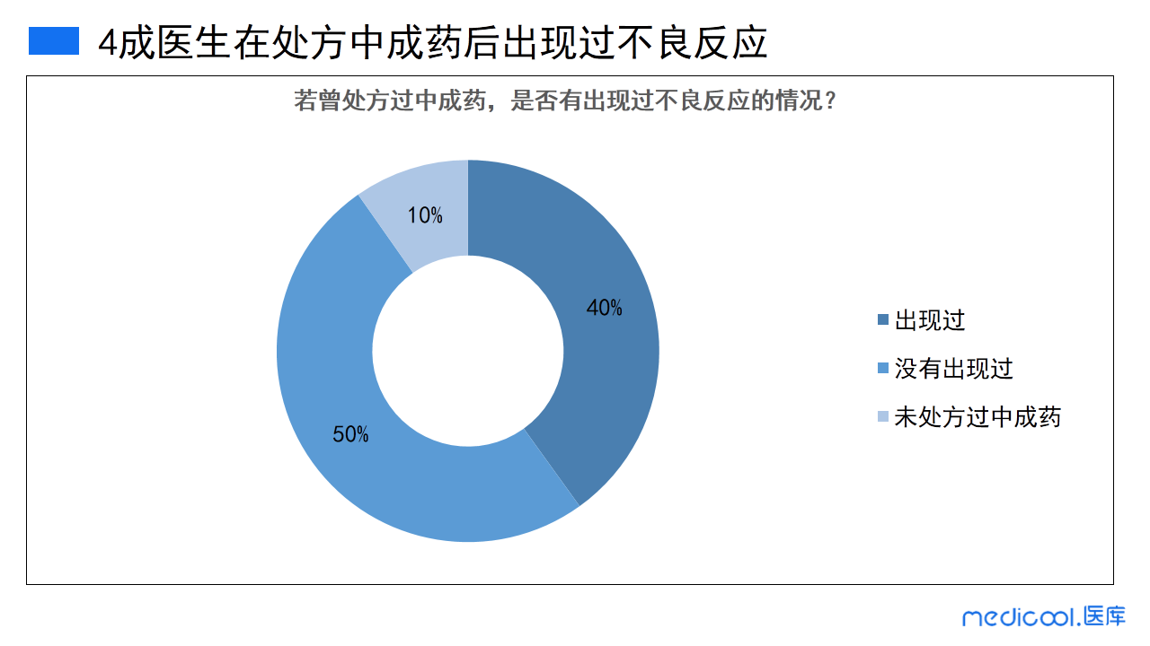 本次调研中,四成医生曾表示在处方中成药后,患者出现过不良反应。中医药虽历史悠久,但其药理毒理尚不明确,也导致了大多数中成药的不良反应不能够明确。