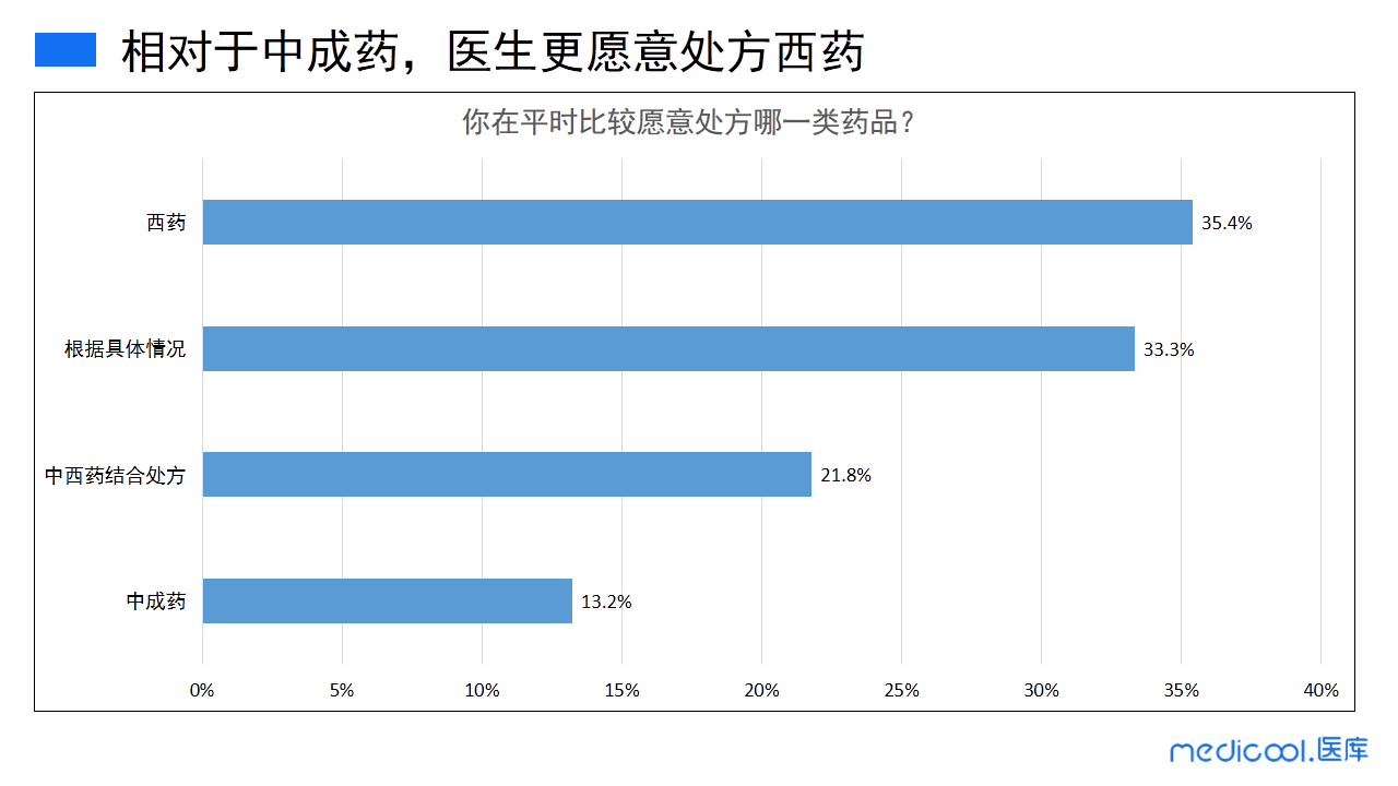 由于西药的注意事项、不良反应、禁忌等比较明确,调研显示,相对于中成药,35.4%的医生平时更愿意处方西药,而直接选择处方中成药的医生仅占13.2%,还有很多医生会根据实际情况进行处方。
