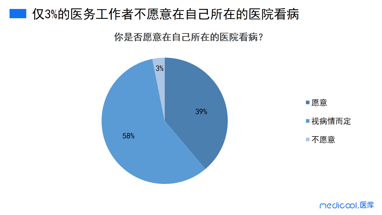 根据调研结果显示,58%的医务工作者视病情而定选择就医医院,39%的人愿意选择在自己所在的医院看病,仅有3%的医务工作者不愿意选择在自己的医院看病。