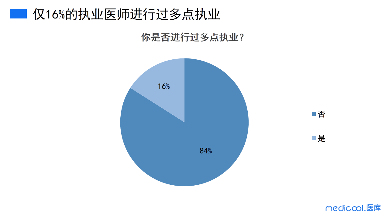 从本次调研数据可以看到,进行过多点执业的医师仅占16%,未进行过多点执业的医生占84%。